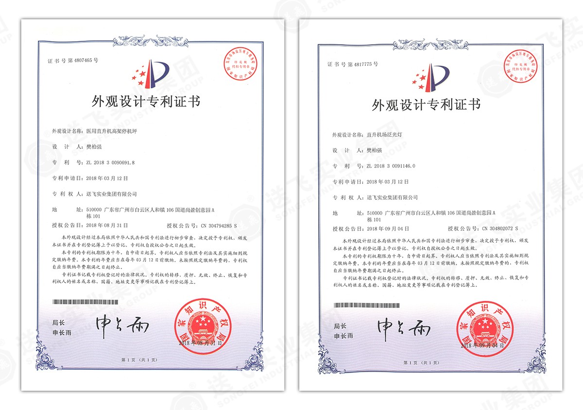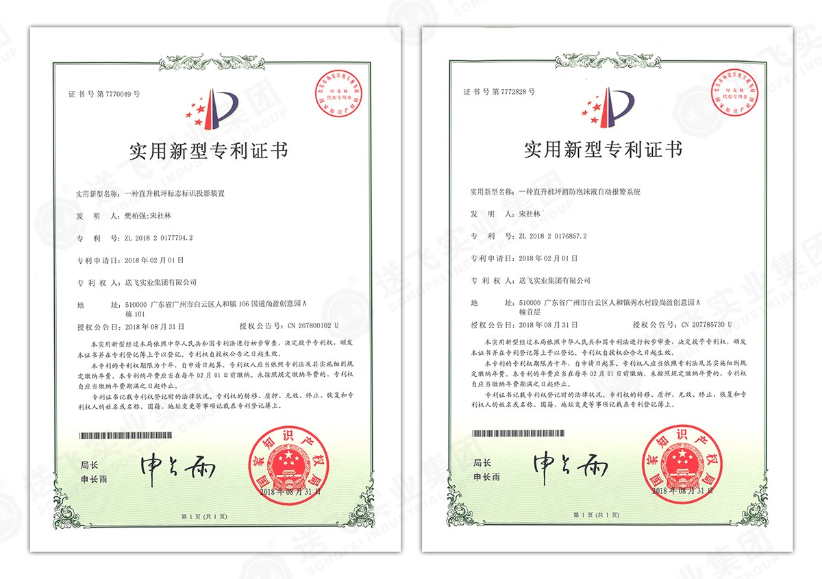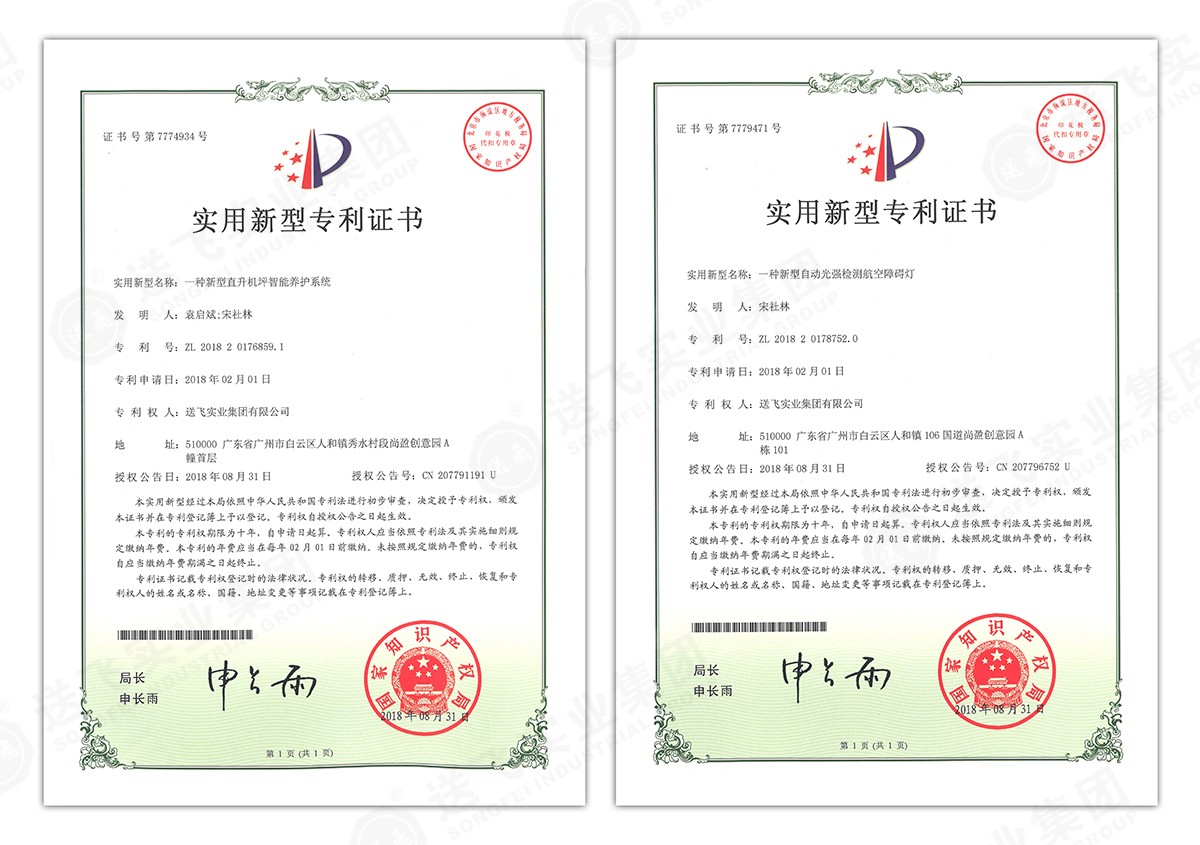 此次新下證專利有22個,其中發(fā)明專利2個,實用新型專利17個,外觀設計專利3個。專利技術涵蓋航空障礙燈、直升機坪等多項產(chǎn)品和業(yè)務。目前,送飛成功申請專利逾百項,填補了行業(yè)多項技術空白。